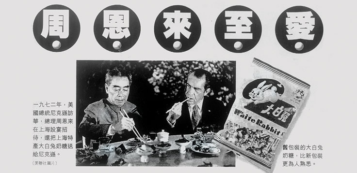 1972年美國(guó)總統(tǒng)尼克松訪華期間,其隨行人員先行來(lái)到上海,覺(jué)得大白兔奶糖香甜可口,就推薦給了尼克松。尼克松吃后也非常喜歡,周總理知道后,當(dāng)即批示將大白兔奶糖作為禮物送給尼克松。 大白兔作為國(guó)禮贈(zèng)送美國(guó)總統(tǒng)后,海外市場(chǎng)的大門(mén)欣然為大白兔開(kāi)啟,在其他國(guó)家也受到人們的追捧。周總理還把大白兔奶糖送給前蘇聯(lián)領(lǐng)導(dǎo)人。